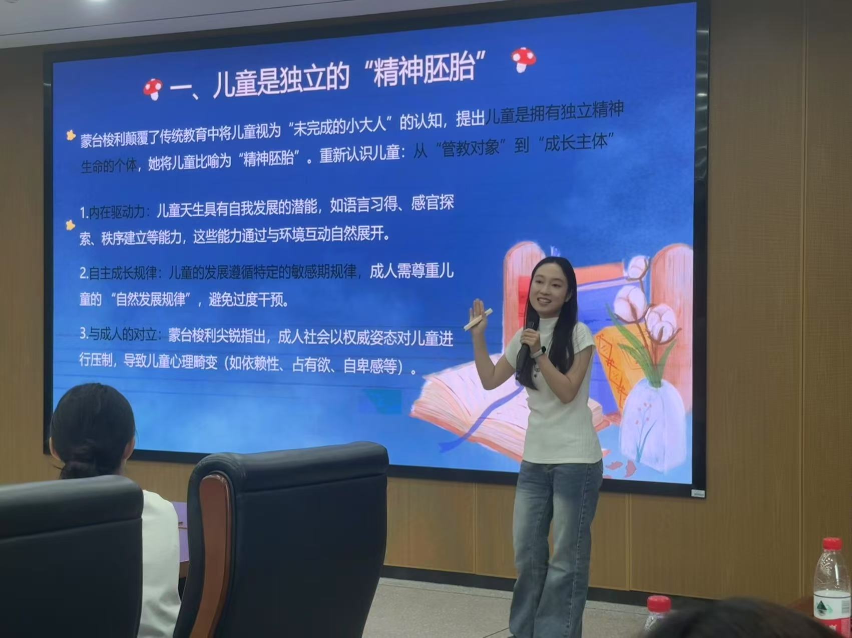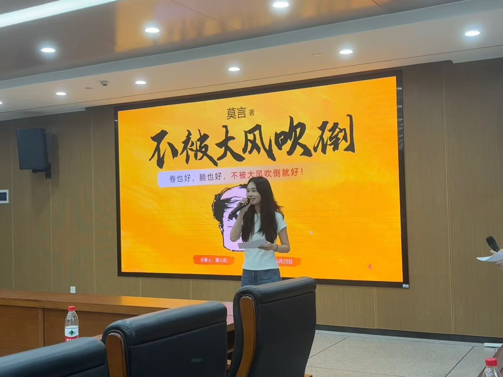 分享会现场亮点纷呈,10支队伍突破传统宣讲模式,以情景剧、弹唱等形式演绎书中精义。第一小组结合视频分享教育启示,更通过弹唱演奏赢得掌声阵阵;第二小组通过读者剧场视频演绎的方式分享黑塞笔下的阅读观,带领大家沉浸于文字与影像交织的精神世界;第七小组的《不被大风吹倒》借助音乐的深情渲染,搭配朗读者饱含情感的语调,将莫言笔下坚韧不屈的故事娓娓道来。