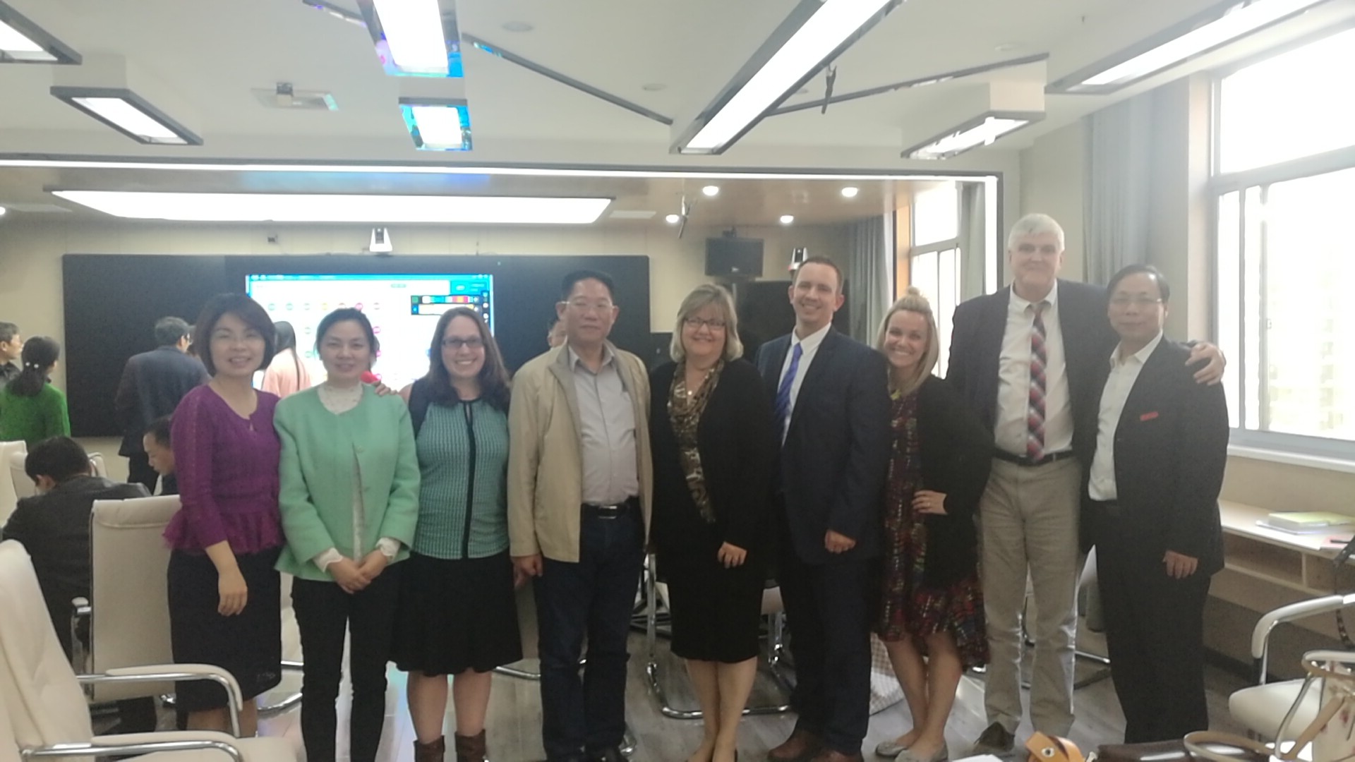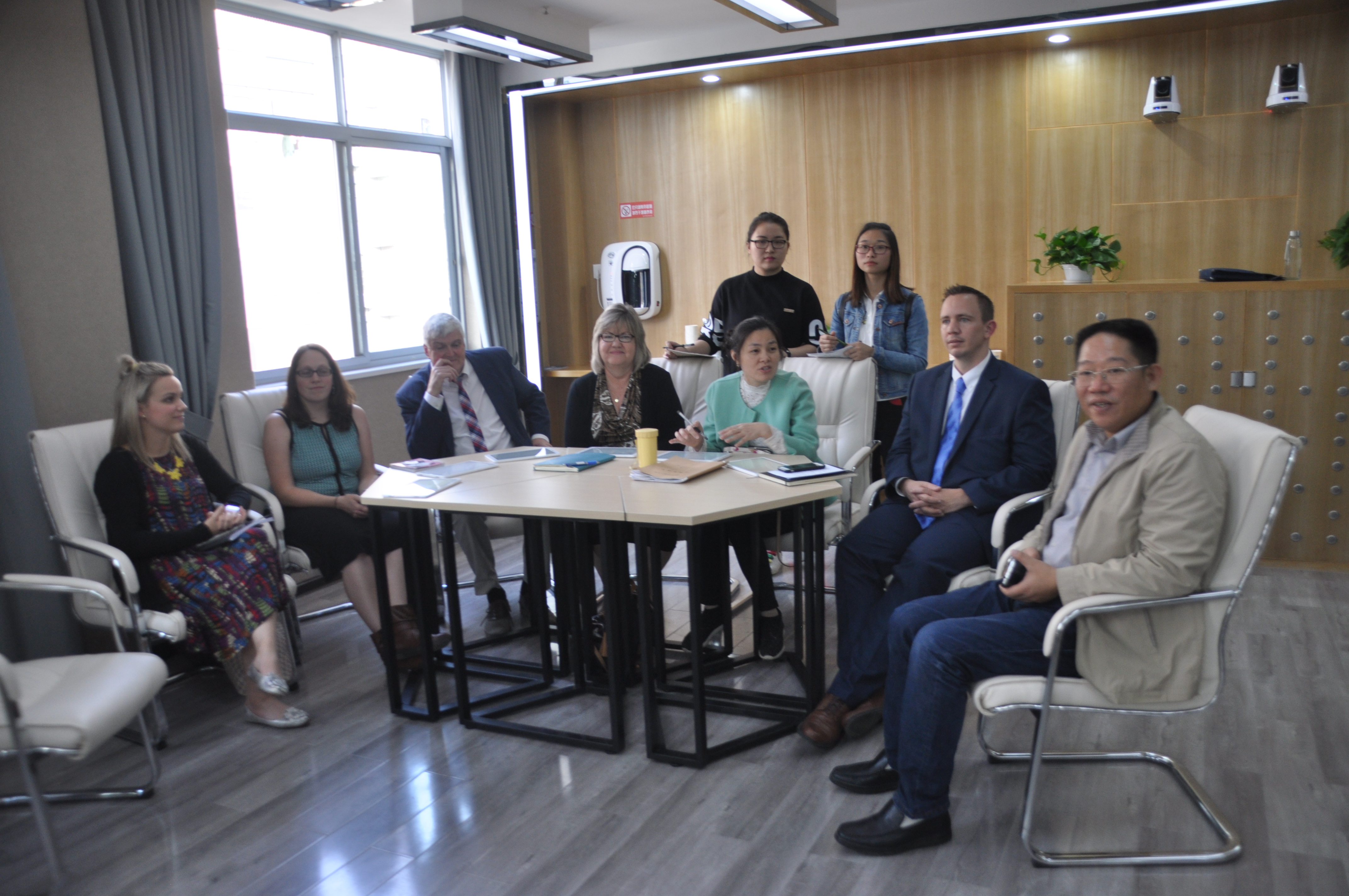岳阳市教科院院长葛天普向乔治福克斯大学教育学院代表团介绍了教科院的基本情况,并带领代表团一行参观了教科院智慧研修中心、智能网络会议室、VR体验台。随后,代表团一行与我省高中教研员一道听取了研修活动主题讲座,并通过参与智慧教室互动学习与教研员们进行了热烈地交流。(教育科学研究所)