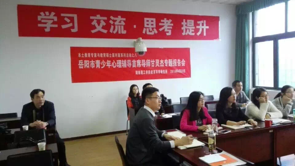 4月20日上午,岳阳市首席青少年心理辅导专家、慧腾青少年成长学校校长、湘阴县政协副主席甘灵杰老师走进我校1303A教室,给我校教育硕士研究生做了一场题为《还世界一点颜色》的讲座。教科所、研究生处相关负责人,全体教育硕士研究生听取了讲座。