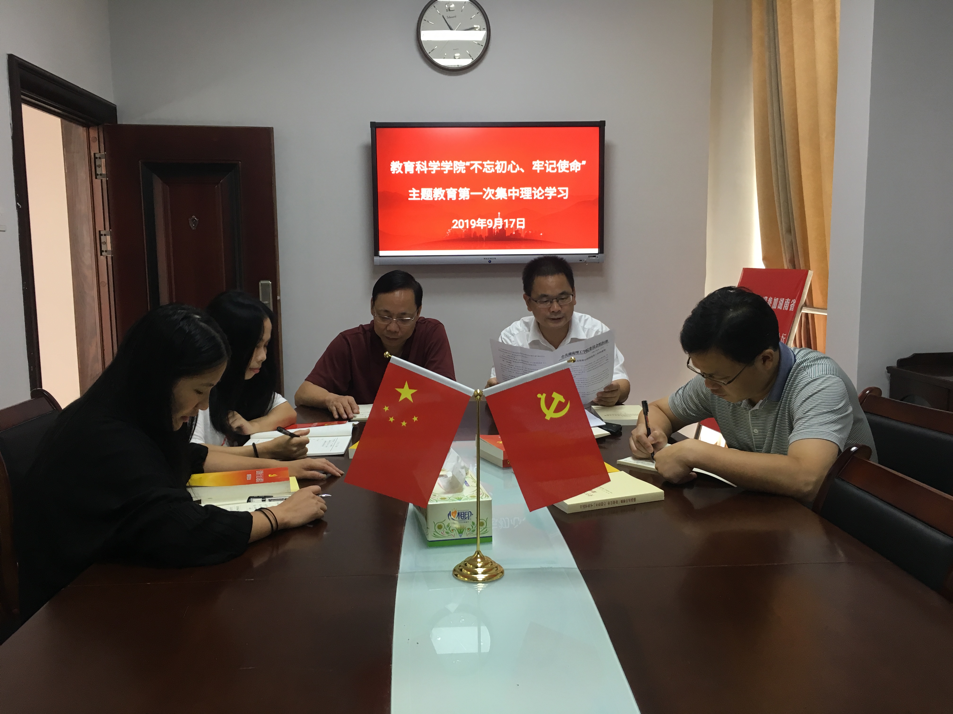 9月17日上午,教育科学学院党总支理论学习中心组在综合楼314会议室举行“不忘初心、牢记使命”主题教育第一次集中学习。全体中心组成员参加学习。教科院院长、党总支副书记刘理主持中心组学习,党总支书记刘淳松主讲。