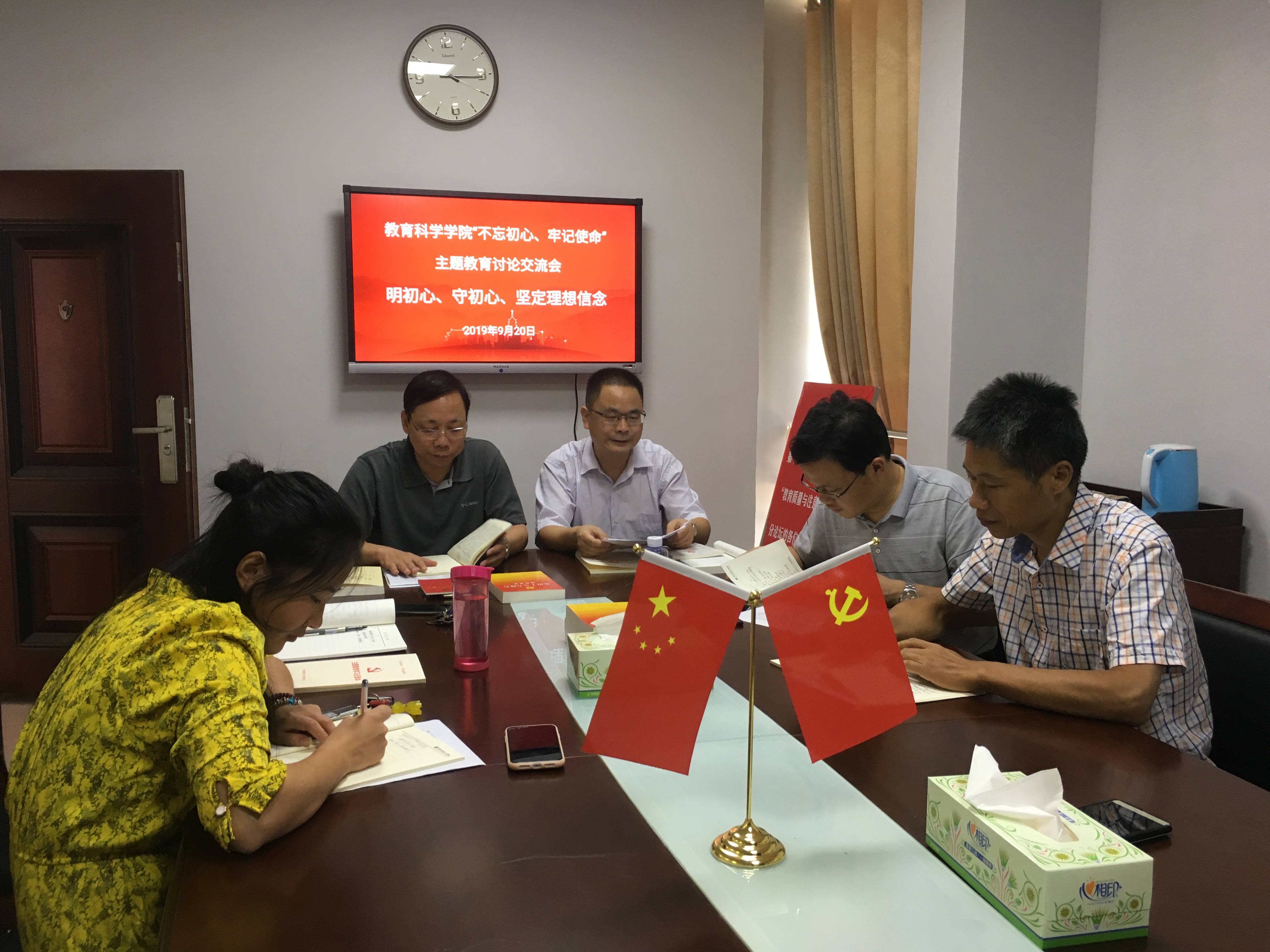 9月20日上午,教育科学学院“不忘初心、牢记使命”主题教育讨论交流会在综合楼314会议室举行。讨论交流主题为“明初心、守初心、坚定理想信念”,学院党总支理论学习中心组全体成员参加学习交流。