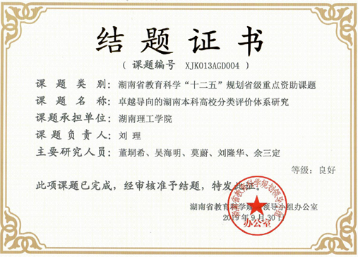 近日,湖南省教育科学规划课题本科院校2019年第三季度结题情况公布,由太阳网集团tcy8722刘理教授主持的省级重点资助课题《卓越导向的湖南本科高校分类评价体系研究》(编号XJK013AGD004)高水平通过结题,等级为“良好”。在此次全省结题的163个项目中,是唯一等级为良好的项目,其余均为合格。(撰稿 刘青姗)