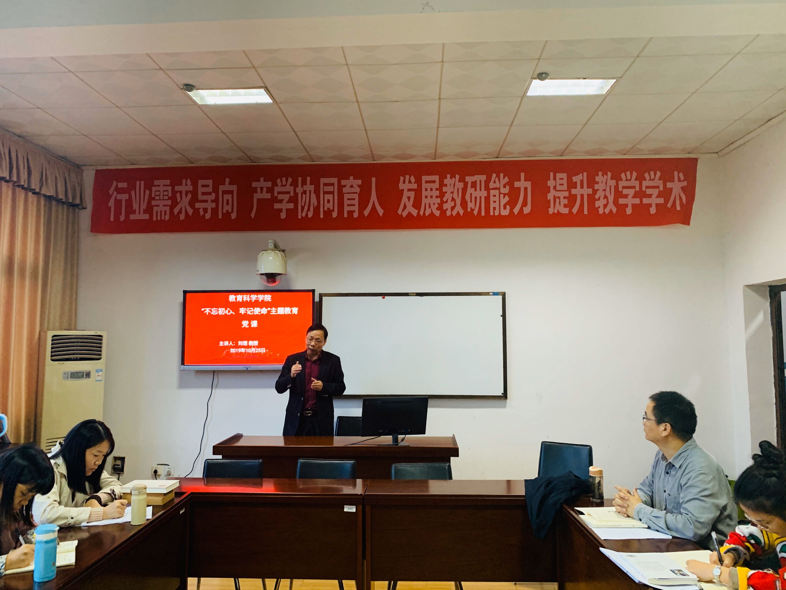 10月25日下午,教育科学学院“不忘初心、牢记使命”主题教育党课在1教学楼1303A教室举行,主题是学习《中国教育现代化2035》,学院院长、党总支副书记、教师支部书记刘理教授主讲。学院部分教师党员和2019级教育管理专业硕士研究生全体党员参加。(撰稿:王群;摄影:孙晗)