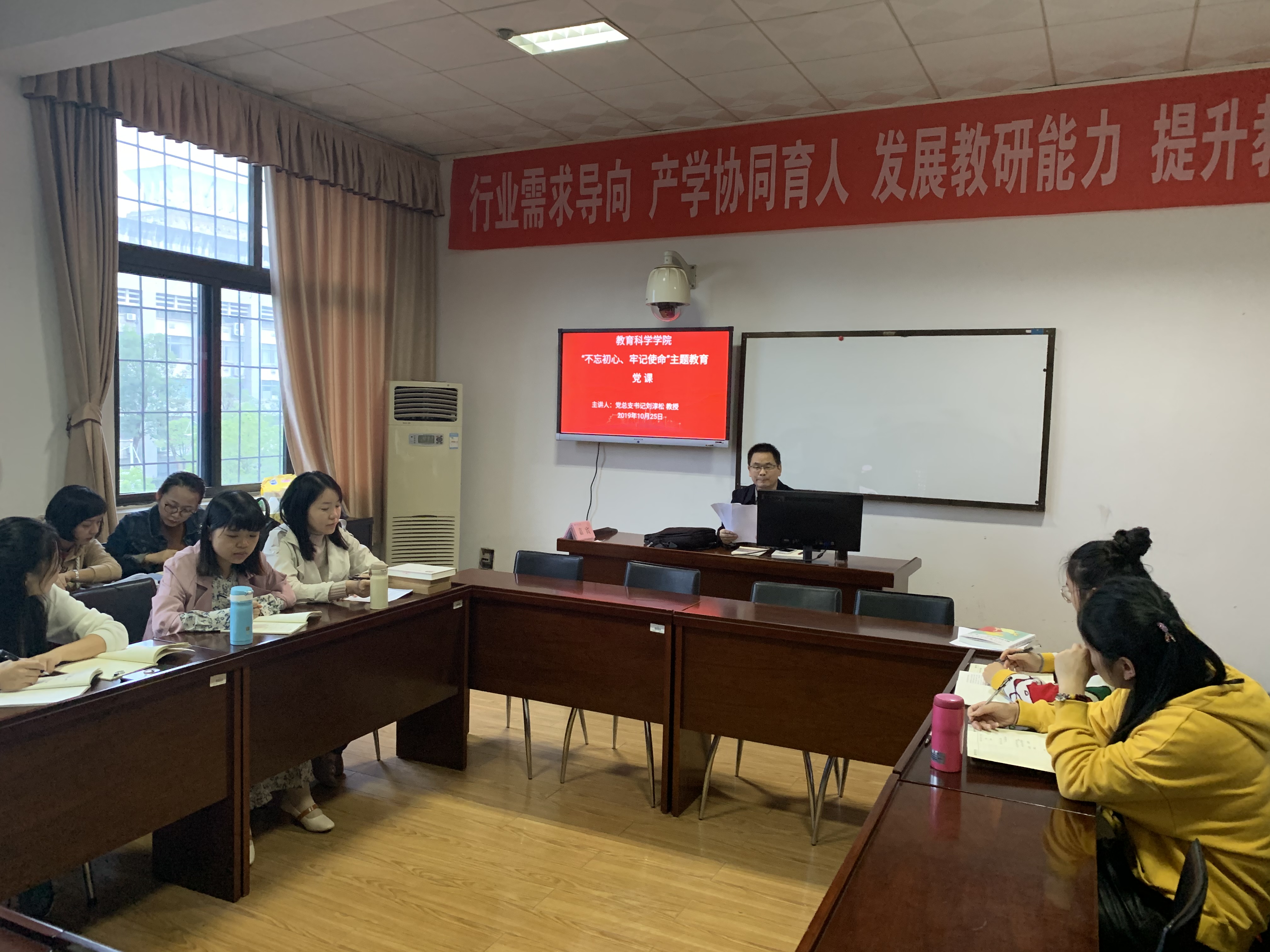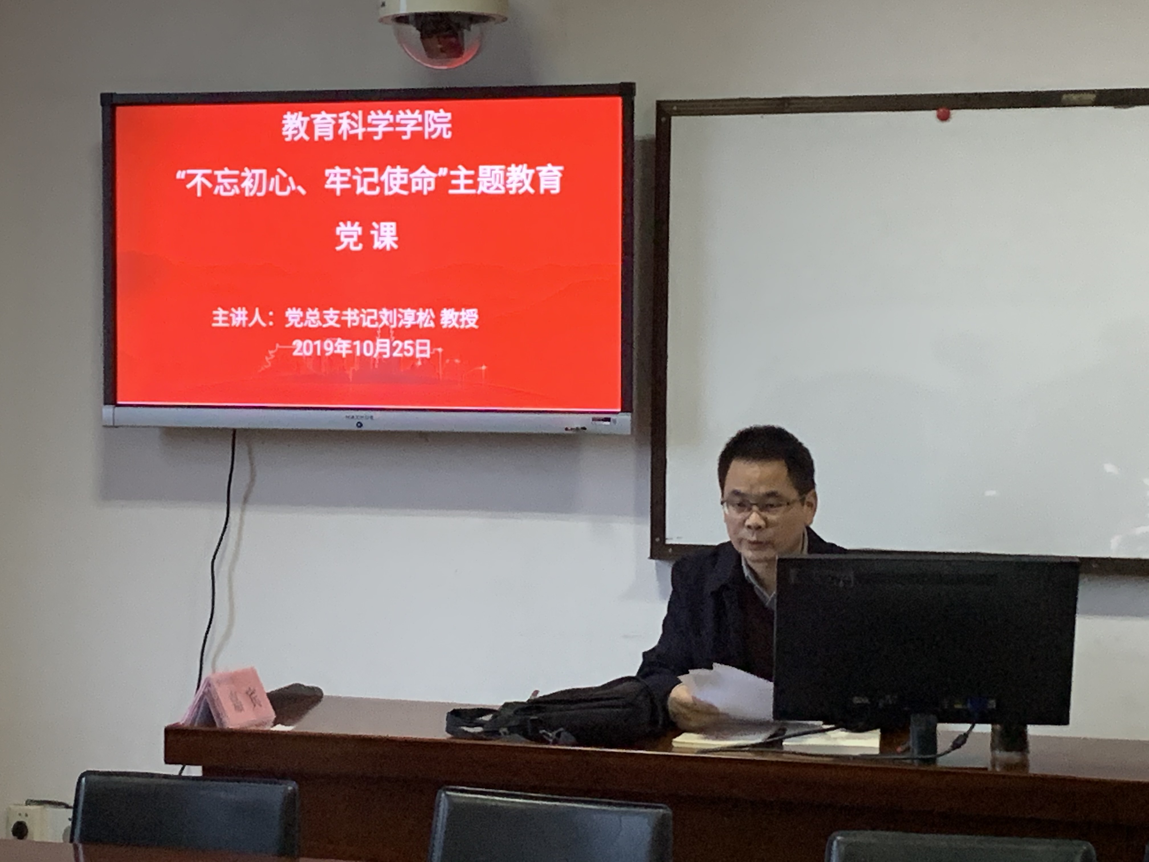 10月25日下午,教育科学学院“不忘初心、牢记使命”主题教育党课在1教学楼1303A教室举行。党课由学院党总支书记刘淳松教授主讲,学院研究生党支部书记王炜及全体研究生党员参加听课,非党员研究生应邀听党课。