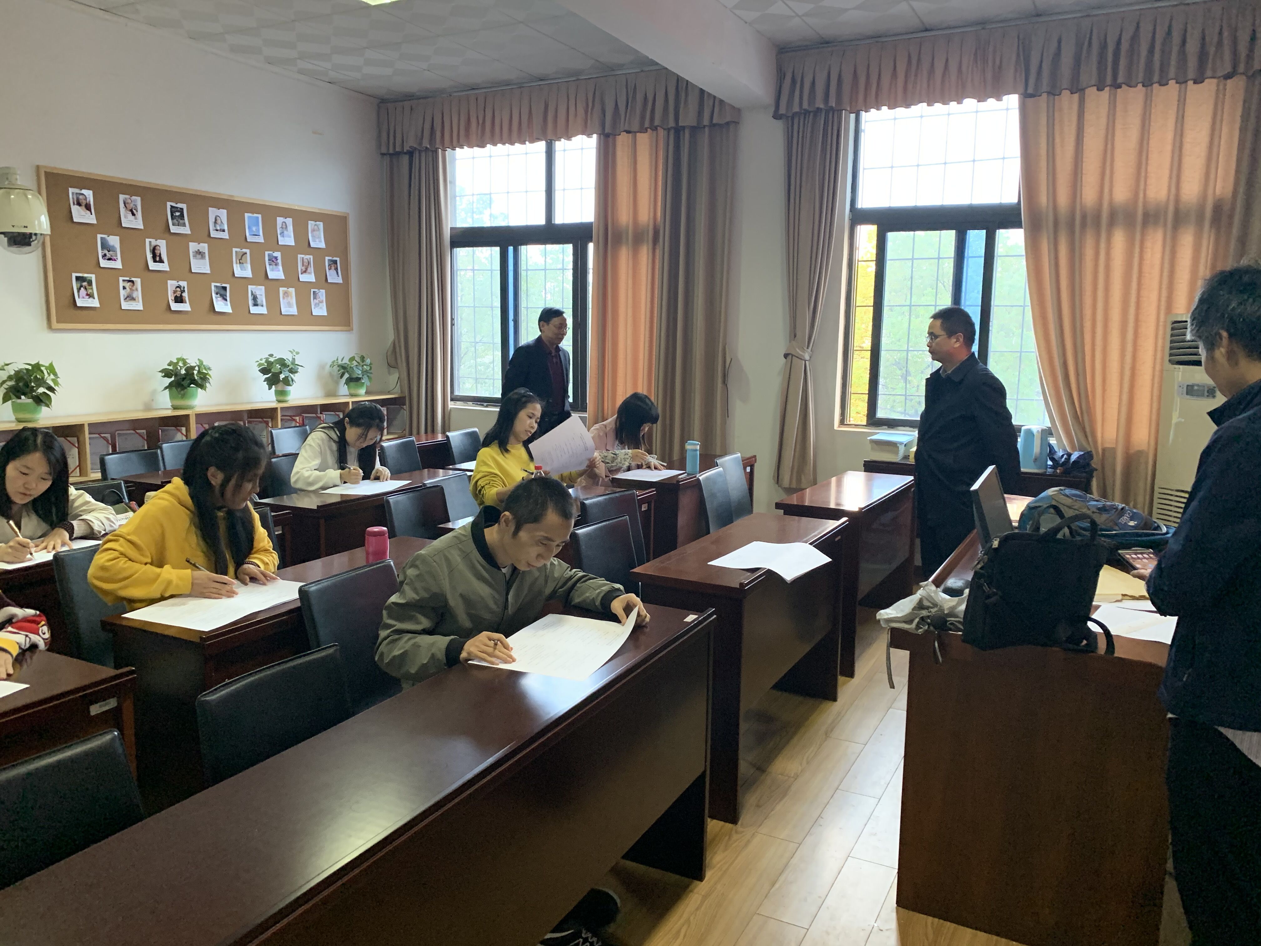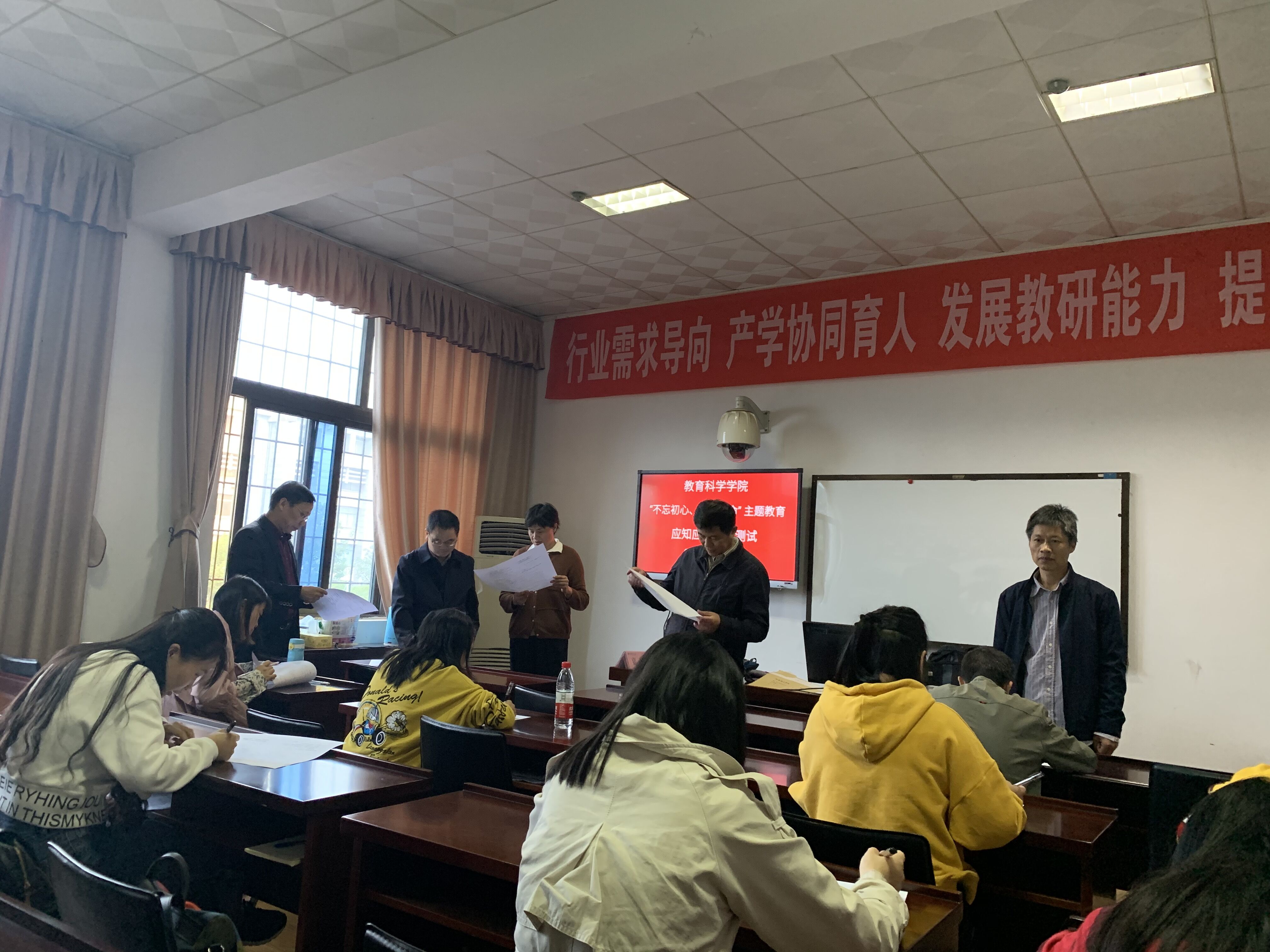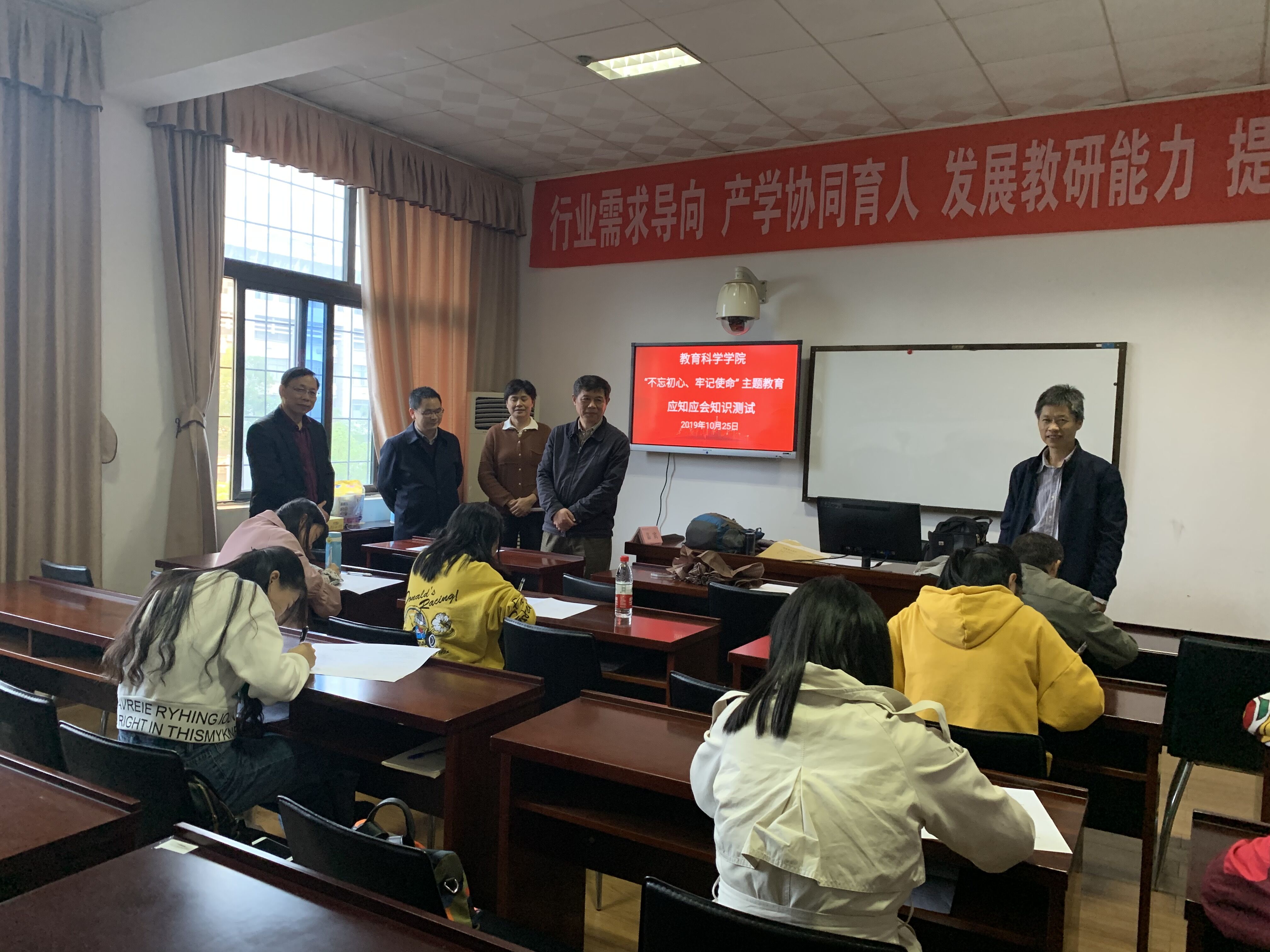 10月25日下午,湖南理工学院按照省委主题教育办的部署和省委第六巡回指导组的指导,组织全校党员师生举行“不忘初心、牢记使命”主题教育应知应会知识测试。教育科学学院考点设东院1教学楼1303A教室,考试采取闭卷形式进行,考试时长为60分钟。学院院长刘理、党总支书记刘淳松、研究生导师王岳斌三人担任监考巡考。