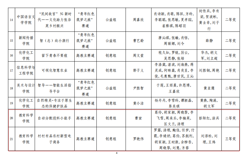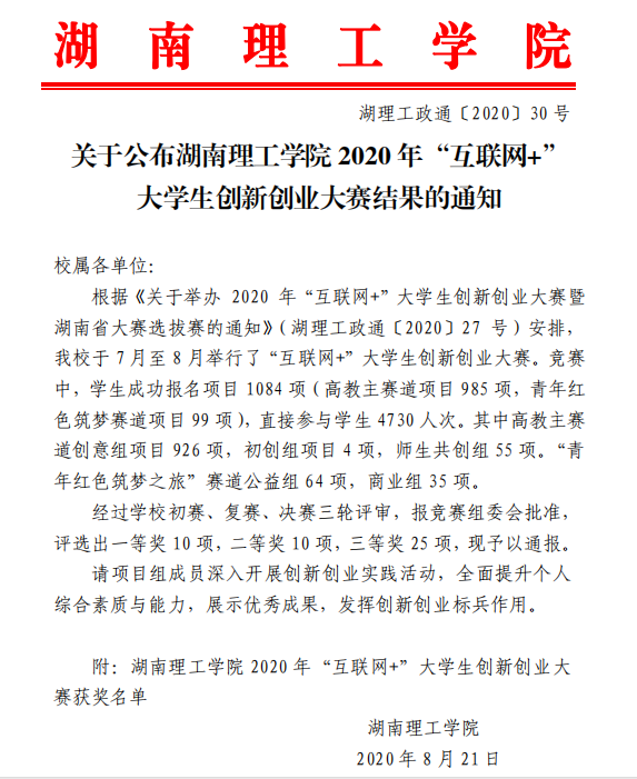 近日,学校下发《关于公布湖南理工学院2020年“互联网+”大学生创新创业大赛结果的通知》(湖理工政通[2020]30号),正式公布学校2020年“互联网+”大学生创新创业大赛决赛结果。为助力研究生成长成才、推动研究生教育改革与发展、落实创新创业教育工作,教育科学学院组织2019级全体教育硕士积极参赛。经学院初赛推荐,校复赛专家网络评审,报学校工作领导小组审定后,唯一的研究生获奖项目由教科院学生入围。最终,曹宣同学荣获二等奖1项,罗艳伟、王群和吴思怡同学荣获三等奖3项。