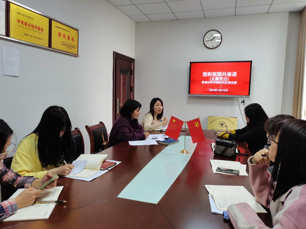 根据校党委组织部的指示精神和学院党总支会议要求,教育科学学院研究生党支部于10月16日在综合楼314会议室开展“我和祖国共奋进”主题党日活动。研究生党支部书记王炜和全体研究生党员参加。