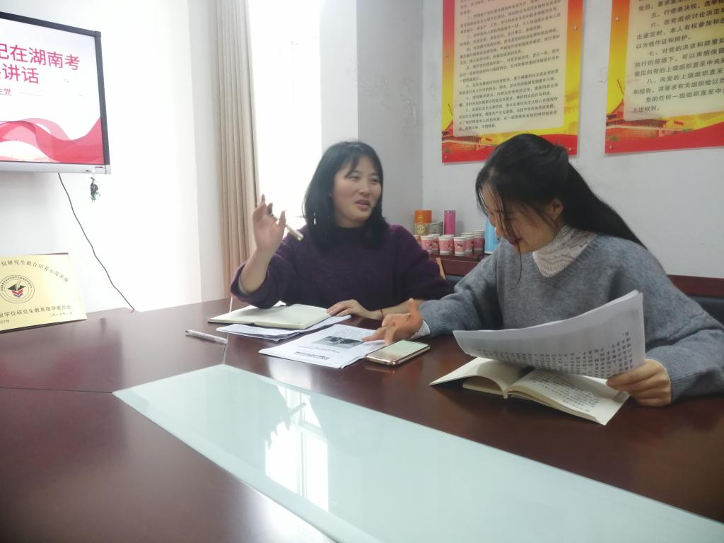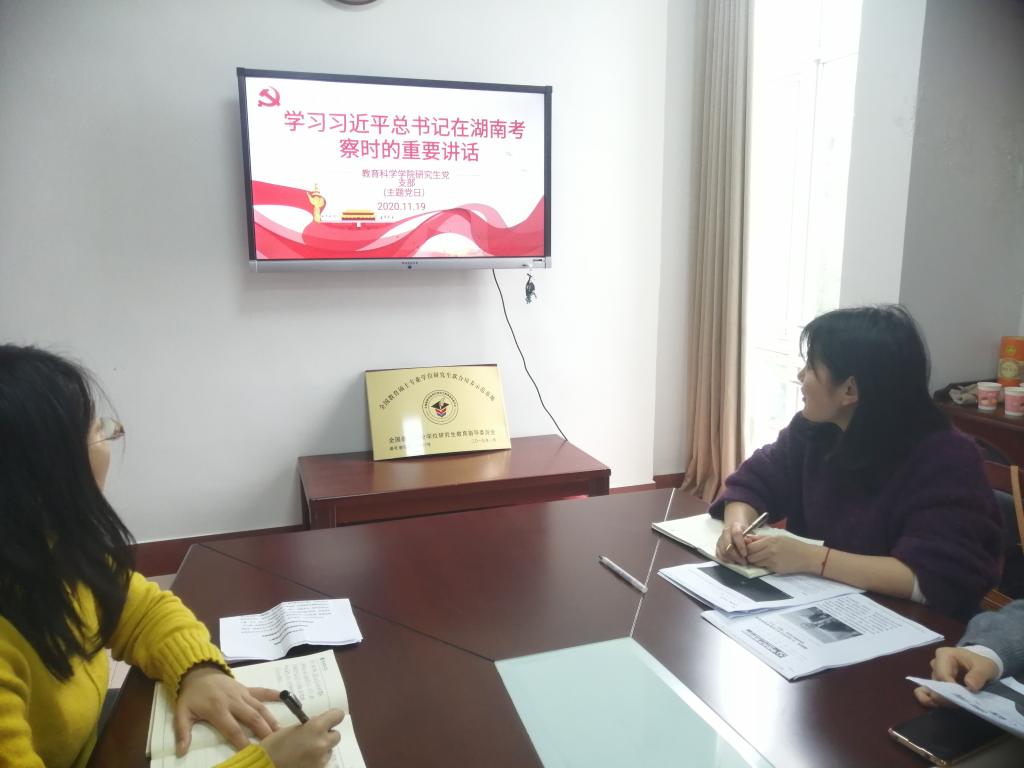 11月19日,教育科学学院研究生党支部在综合楼314会议室开展“学习习近平总书记考察湖南重要讲话精神”主题党日活动。研究生党支部书记王炜和全体研究生党员参加。