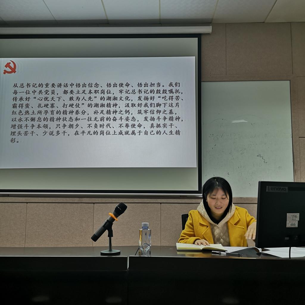 王炜讲课过程中指出,我们要从总书记的重要讲话中悟出信念、悟出使命、悟出担当。我们每一位中共党员,都要立足本职岗位,牢记总书记的殷殷嘱托,传承好“心忧天下、敢为人先”的湖湘文化,发扬好“吃得苦、霸得蛮、扎硬寨、打硬仗”的湖湘精神,汲取好我们脚下这片红色热土所孕育的精神养分,补足精神之钙,筑牢信仰之基,以永不懈怠的精神状态和一往无前的奋斗姿态,发扬斗争精神,增强斗争本领,只争朝夕、不负时代、不辱使命,真抓实干、埋头苦干、少说多干,在平凡的岗位上成就属于自己的人生精彩,立志成为新时代的好老师。(撰稿:彭娅伦)