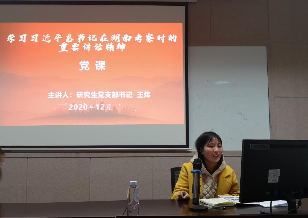 12月1日上午,教育科学学院研究生党支部“学习习近平在湖南考察时期重要讲话精神”专题党课在1号教学楼1302教师开讲,学院研究生党支部书记王炜主讲。全体研究生党员及党外学生参加学习。