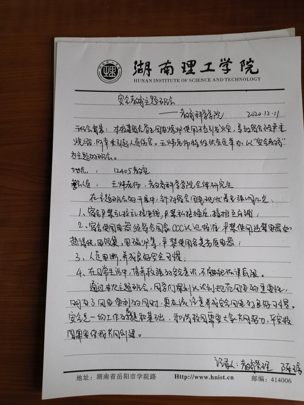 班会结束后,学院党总支书记刘淳松、辅导员王炜和全体研究生赴学生寝室12栋举行安全警示教育。在警示教育现场,刘淳松再次对学生寝室安全提出明确要求。