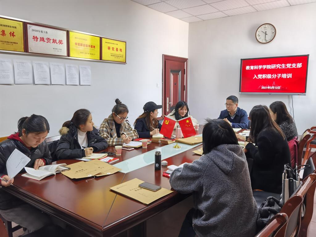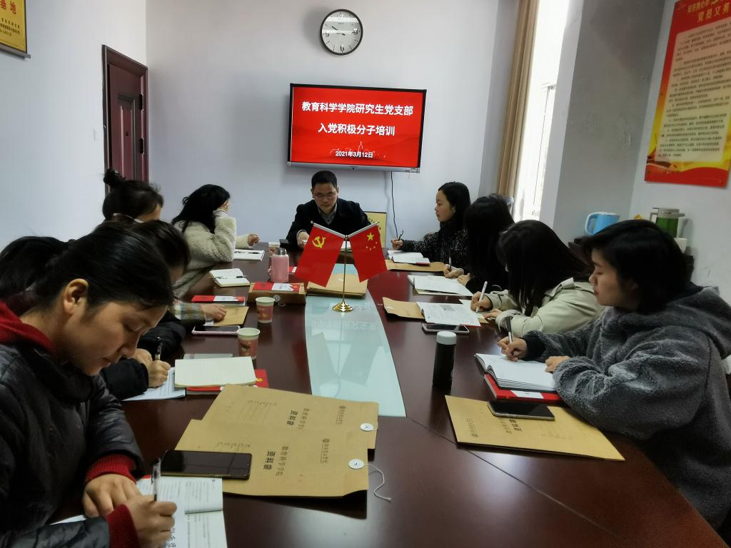 3月12日上午10时,教育科学学院研究生党支部在学院党员活动室(综合楼314室)举行入党积极分子教育培训。学院党总支书记刘淳松、研究生党支部书记王炜和全体入党积极分子参加。