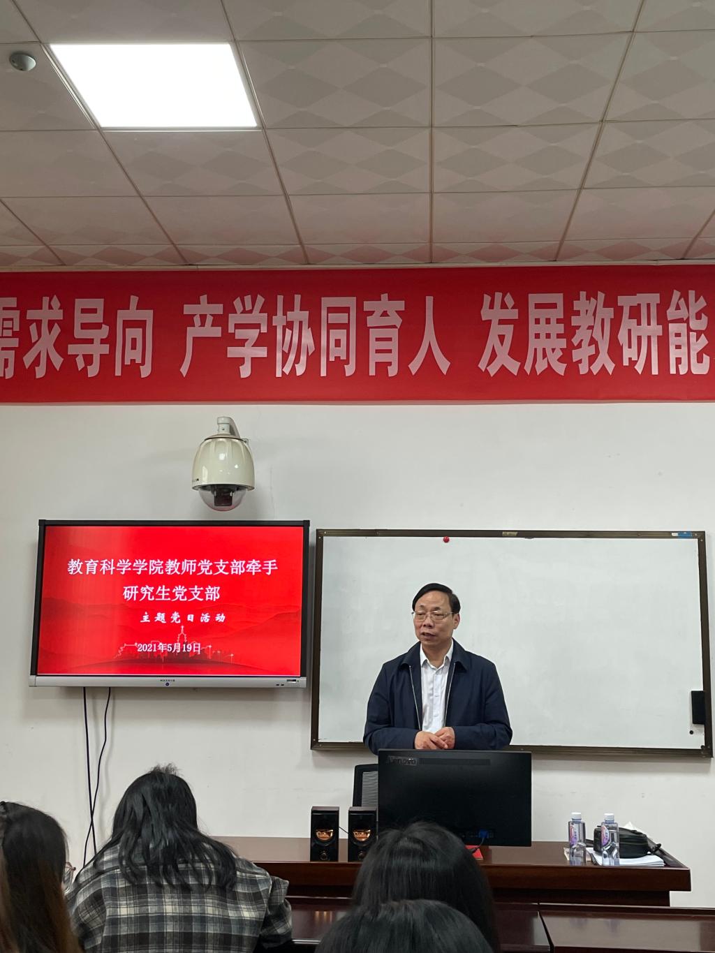 5月19日上午,教育科学学院院长、教师党支部书记刘理在1303A教室给研究生讲党课。同时,教师支部与研究生支部举行牵手活动,开展主题党日学习,共同学习党史。研究生支部书记王炜及2020级全体研究生参加。