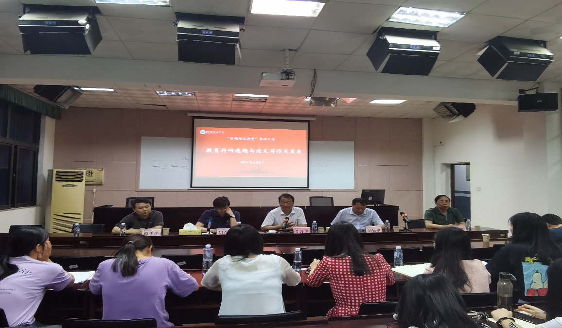四位教育研究专家围绕教育科研选题以及论文写作和发表中的关键问题,结合个人的研究和指导研究生的实际,娓娓道来。李海萍教授以教育科研论文写作技巧为主线,根据自己在学术研究道路上的体验,就在教育科研论文的撰写过程中如何恰当选材、调整结构、优化表达方式等方面提出了针对性建议。刘德华教授从科研主题选择、问题意识、参考文献、研究方法等五方面对在教育科研论文写作过程中通常会碰到的关键问题进行深刻剖析。胡春光教授以诙谐的语言,深入浅出地分享了他自己“跳出教育看教育”的体会,语重心长地告诫同学们对学术研究需保持一颗“敬畏之心”。谭千保教授用浅显易懂的话术分享了如何树立正确的论文写作观念,细述了科研论文投稿和发表流程,并阐明了一些论文的调研途径和调研方法。