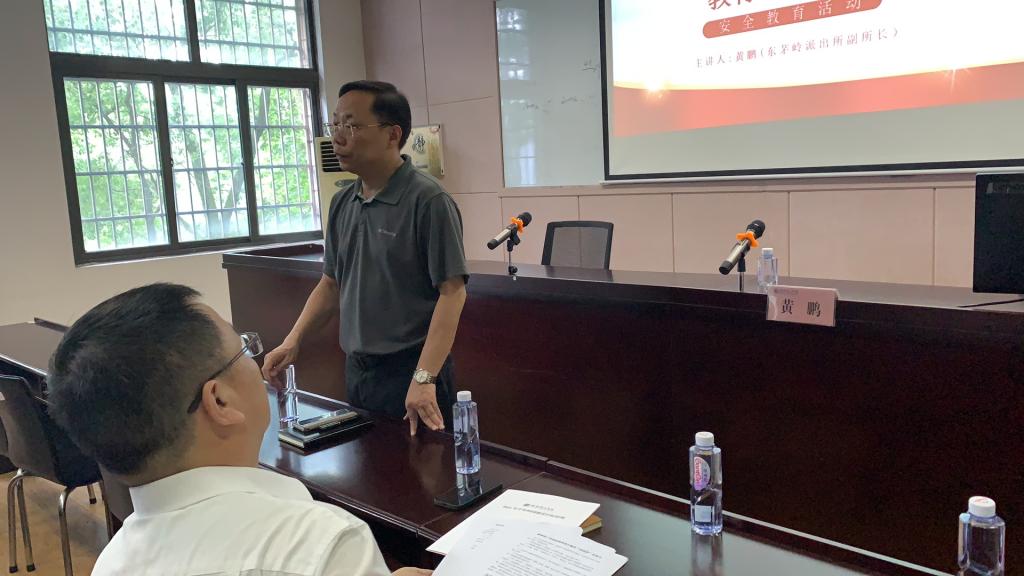 为确保学生人身、财产和意识形态安全,6月29日下午,教育科学学院在1教学楼1302教室开展安全教育,并特邀岳阳市公安局东茅岭派出所副所长黄鹏来校开展预防电信诈骗讲座。学院院长刘理、党总支书记刘淳松、研究生辅导员王炜及全院研究生等参加。