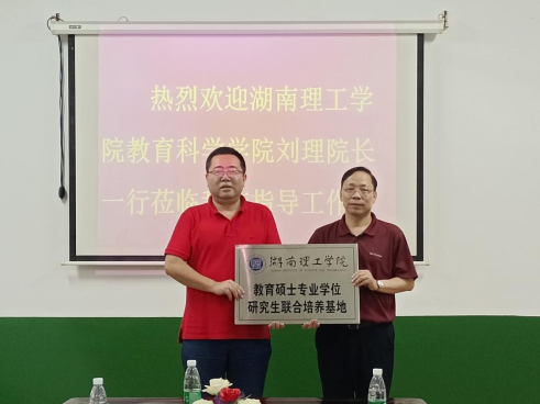 79日下午,教育科学学院院长刘理一行来到汨罗市第三中学,为我校教育硕士专业学位研究生联合培养基地授牌。该校校长龚海军热情接待了刘理一行,双方就教育管理和学科教学领域教育硕士实践教学等联合培养问题进行了深入探讨。