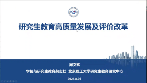 2021年8月26日下午4时,北京理工大学周文辉教授为2021年湖南省研究生暑期学校的学员作报告,题目是《研究生教育高质量发展及评价改革》。内容包括:“2013年至今的我国研究生教育”,“研究生教育发展现状:数据”,“研究生培养质量保障机制”,“研究生教育评估现状”与“研究生教育评价改革”五个方面。
