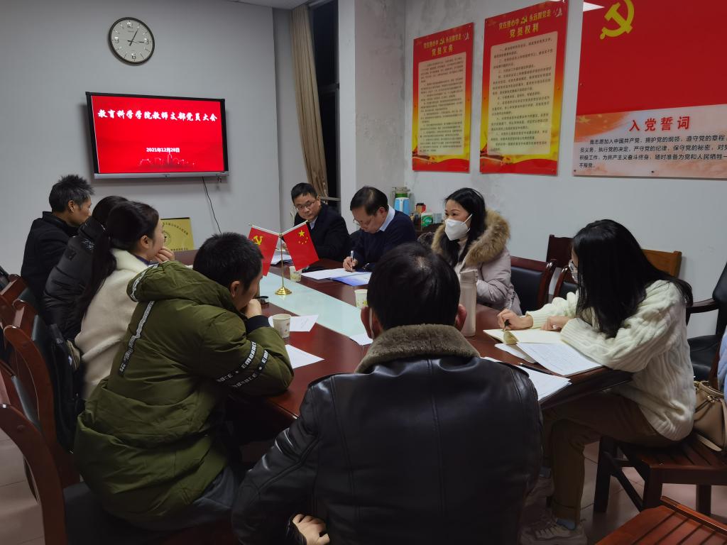 根据学校党委组织部发布的《党建工作提示(2021 年 12 月-2022 年 1 月)》(湖理工组通〔2021〕14 号 )要求,12月28日晚,教育科学学院教师党支部在综合楼314会议室召开组织生活会暨民主评议党员大会。会议由学院教师党支部书记洪冬美主持,全体教师党员参议。学院党员领导干部刘淳松、刘理、王岳斌等同志以普通党员身份参加支部组织生活会。
