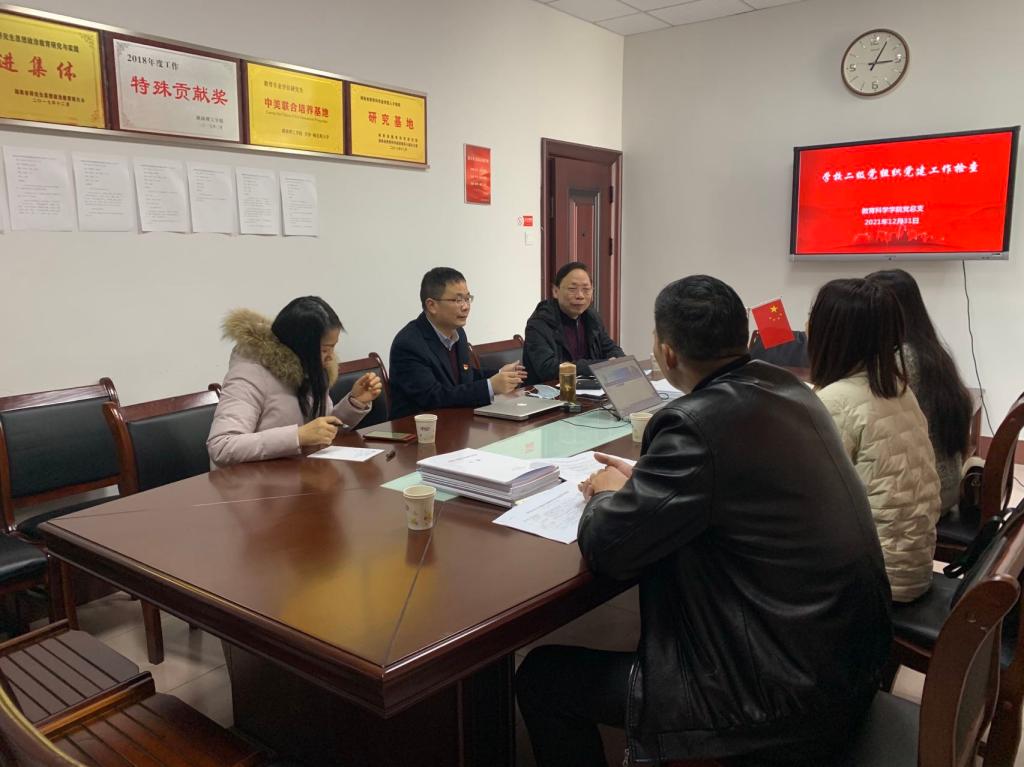 12月31日上午,学校党建工作检查组童沁、李一飞、夏玉宁一行,到教育科学学院检查指导。学院院长、党总支副书记刘理,党总支书记刘淳松,总支委员、教师支部书记洪冬美,学位点秘书黄灿参加检查交流。