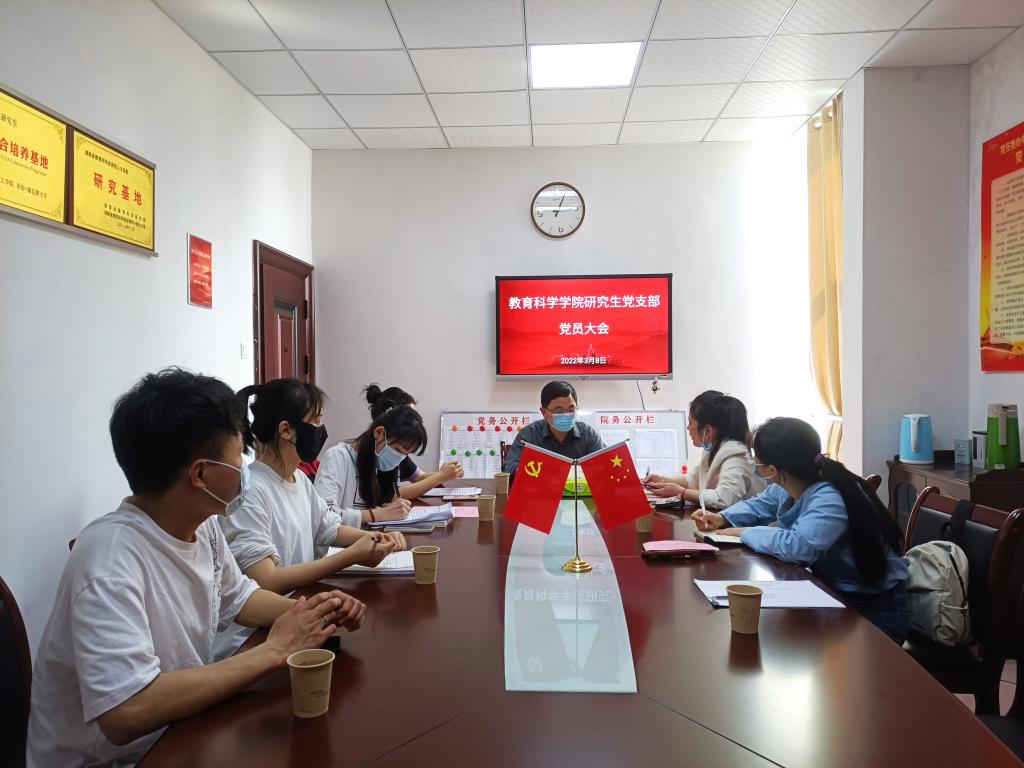 3月15日下午,教育科学学院研究生党支部党员大会在综合楼314会议室召开。学院党总支书记刘淳松与会指导,研究生党支部书记王炜及学院全体研究生党员参会。会议由研究生支部副书记陈洁仪主持。
