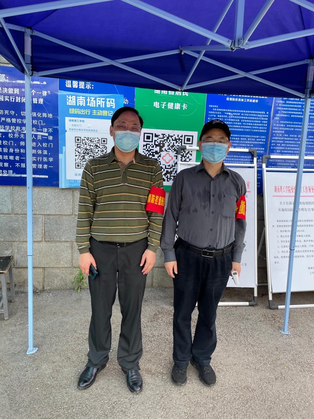 为贯彻落实学校疫情防控各项工作部署,教育科学学院院长、党总支副书记刘理同志,党总支书记刘淳松同志,充分发挥党员先锋模范作用,积极响应学校关于抽调教职工参与学校门岗疫情防控管理的号召,主动报名参与门岗管理。