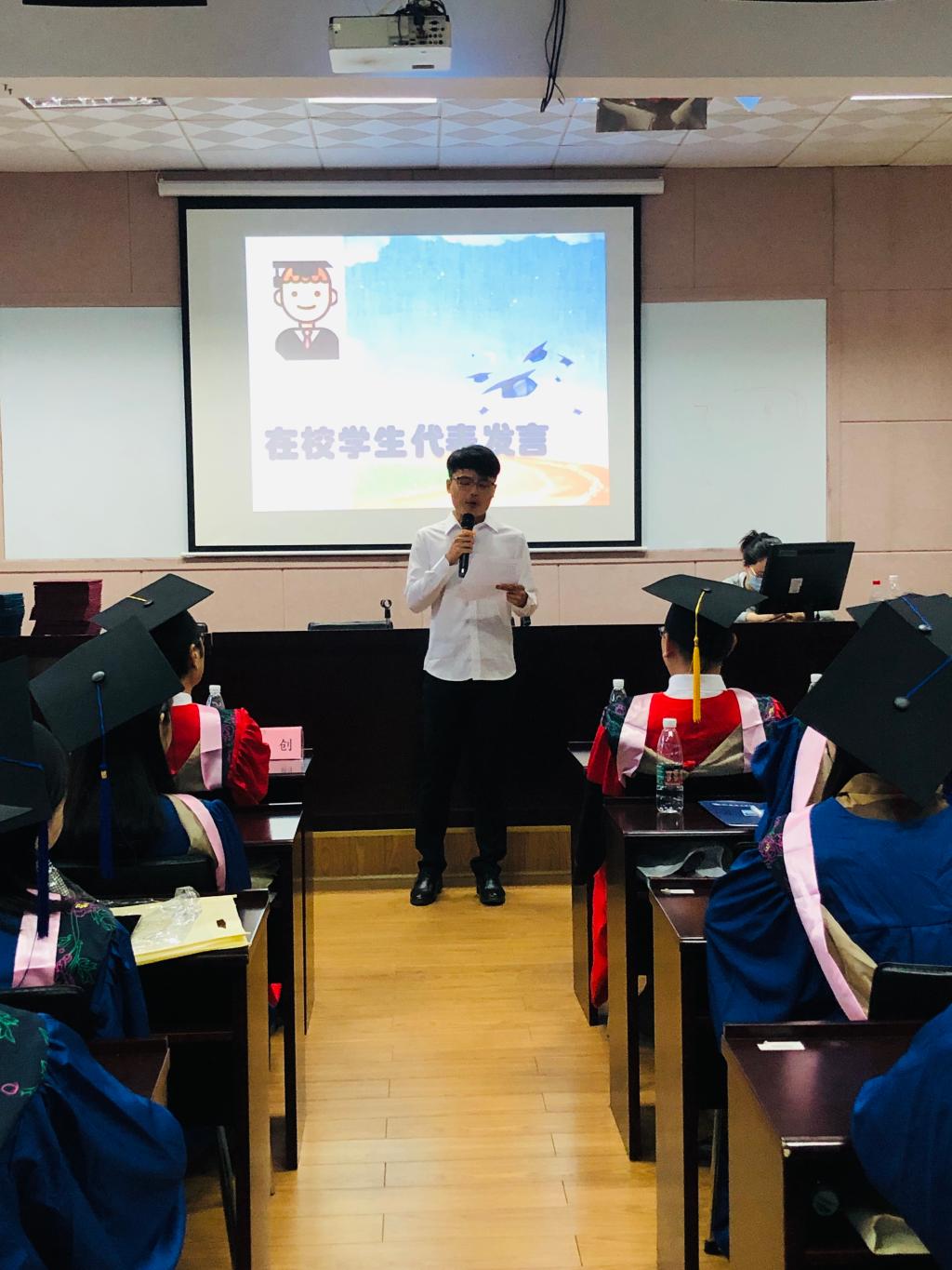 毕业典礼在观看毕业视频中拉开了帷幕,一张张照片重现了毕业生们在湖南理工学院的点点滴滴。2021级研究生谢阳正代表在校生为学长学姐们送上了诚挚的祝福。今年考入湖南师范大学的博士彭娅伦代表毕业生发言,她深情回顾了在湖南理工学院的美好时光,感恩母校和师长的精心培育,号召毕业生担当新使命,创造新辉煌。相信如她所说的,承载着梦想的毕业生们,一定会更加自信、勇敢、坚强地面对未来。来到了典礼中最重要的环节,与会的领导和导师们为硕士学位获得者逐一颁发学位证书并拨穗。