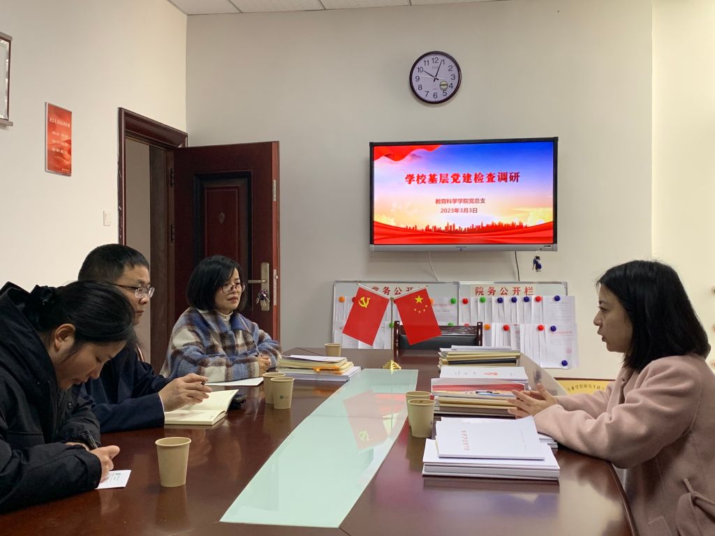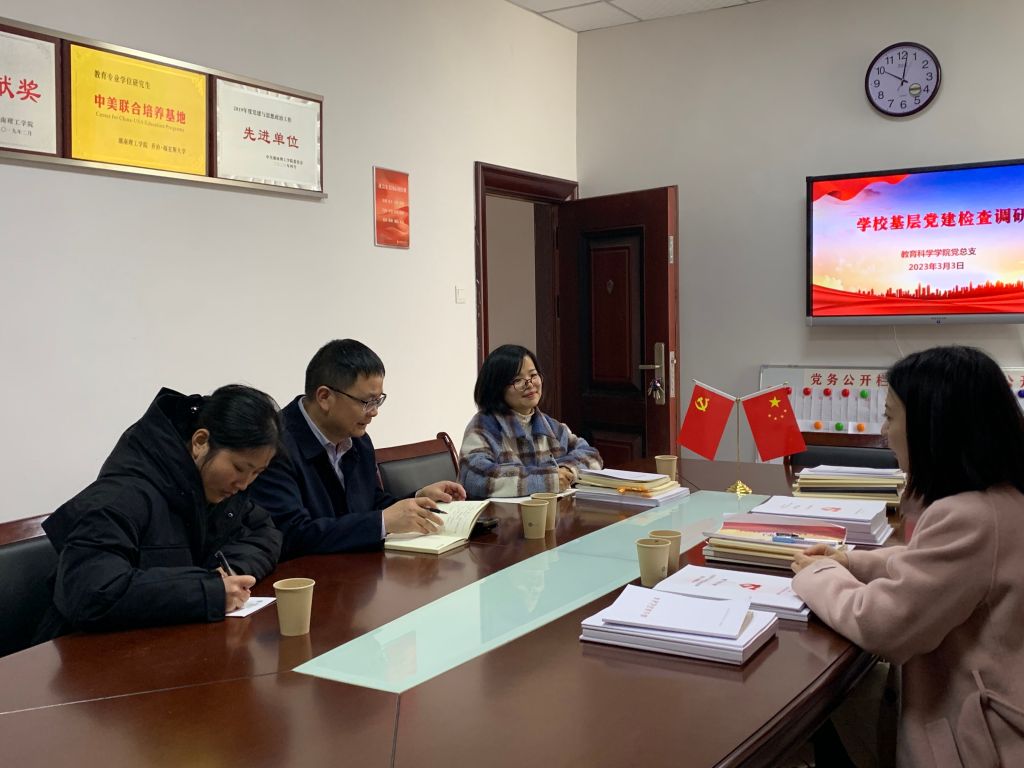 3月3日上午,校党委组织部干部童沁代表学校党建工作调研组到教育科学学院调研检查指导。学院党总支书记刘淳松,党总支专职组织员、研究生党支部书记王炜,教师党支部副书记黄灿参加调研检查交流。