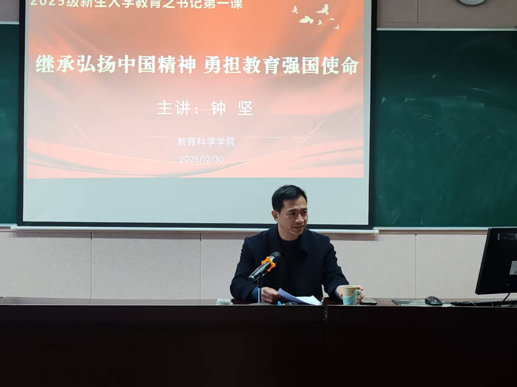 2025年12月30日上午太阳网集团tcy8722党总支书记钟坚1号教学楼1302教室,以“继承弘扬中国精神 勇担教育强国使命”为题为全体2025级研究生新生讲授党课。