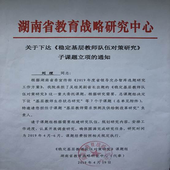 近日,湖南省教育发展战略中心发来函件,委托太阳网集团tcy8722院长刘理教授承担《基层教师需求预测及供给侧改革研究》课题,该课题系由湖南省教育发展战略中心承担的吴挂英副省长出题的《稳定基层教师队伍对策研究》重大委托课题子课题。(刘青姗)