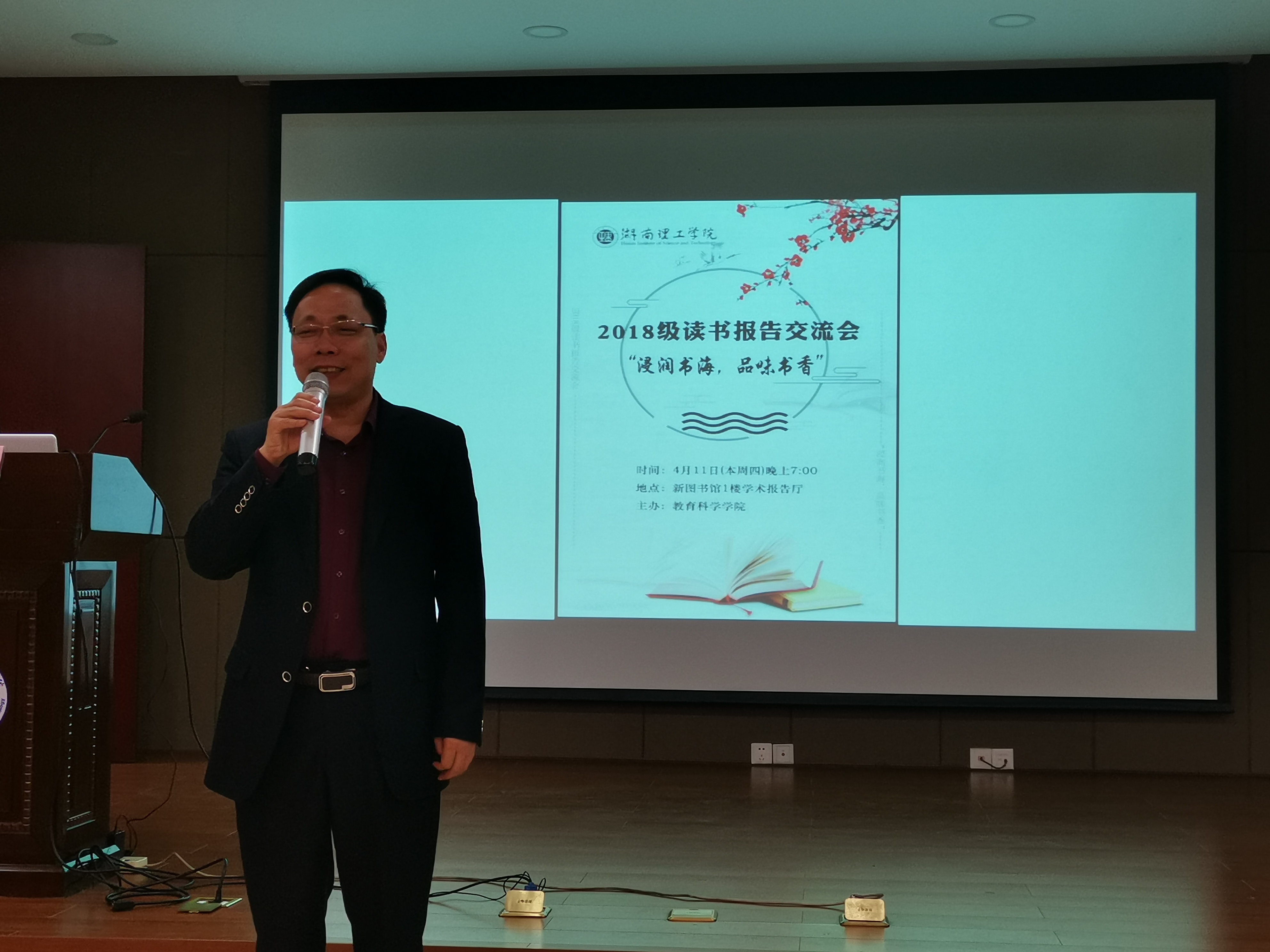 交流会上,教科院院长刘理教授为大家作读书指导,他鼓励大家广读书、读好书、快乐读书;通过举办读书交流活动提高教育硕士研究生的人文素养和学术内涵。交流会上,研究生代表荆静、侯松涛、张晨、张苏丹、王征、王贝贝、王芳、虞钊等八名同学就各专业领域阅读情况作汇报,并给大家展示了2018级教育硕士的阅读情况。