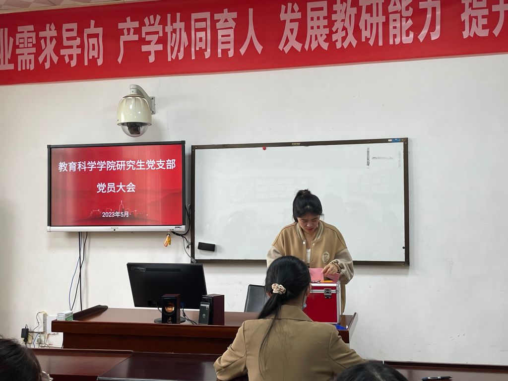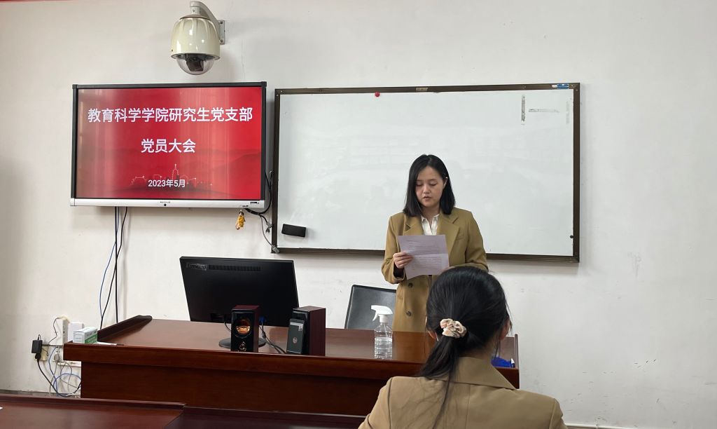 2023年5月23日下午,教育科学学院研究生党支部在1303A教室召开接收预备党员大会。学院党总支负责人、入党介绍人、研究生党支部全体党员及部分入党积极分子参会。