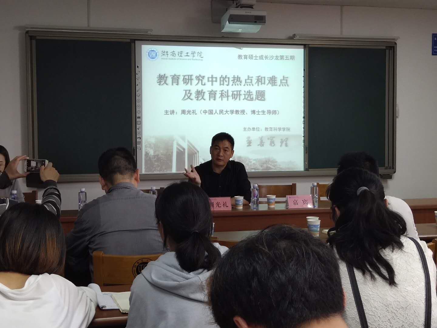 5月17日下午,由教育科学学院主办的教育硕士成长沙龙第五期在12教学楼12405教室举行,特邀中国人民大学博士生导师周光礼教授主讲。学校研究生院党总支书记李丽荣,校友办主任周畅,教育科学学院院长刘理、党总支书记刘淳松、副院长彭阳红等领导老师及2018级教育硕士研究生参与本次成长沙龙。