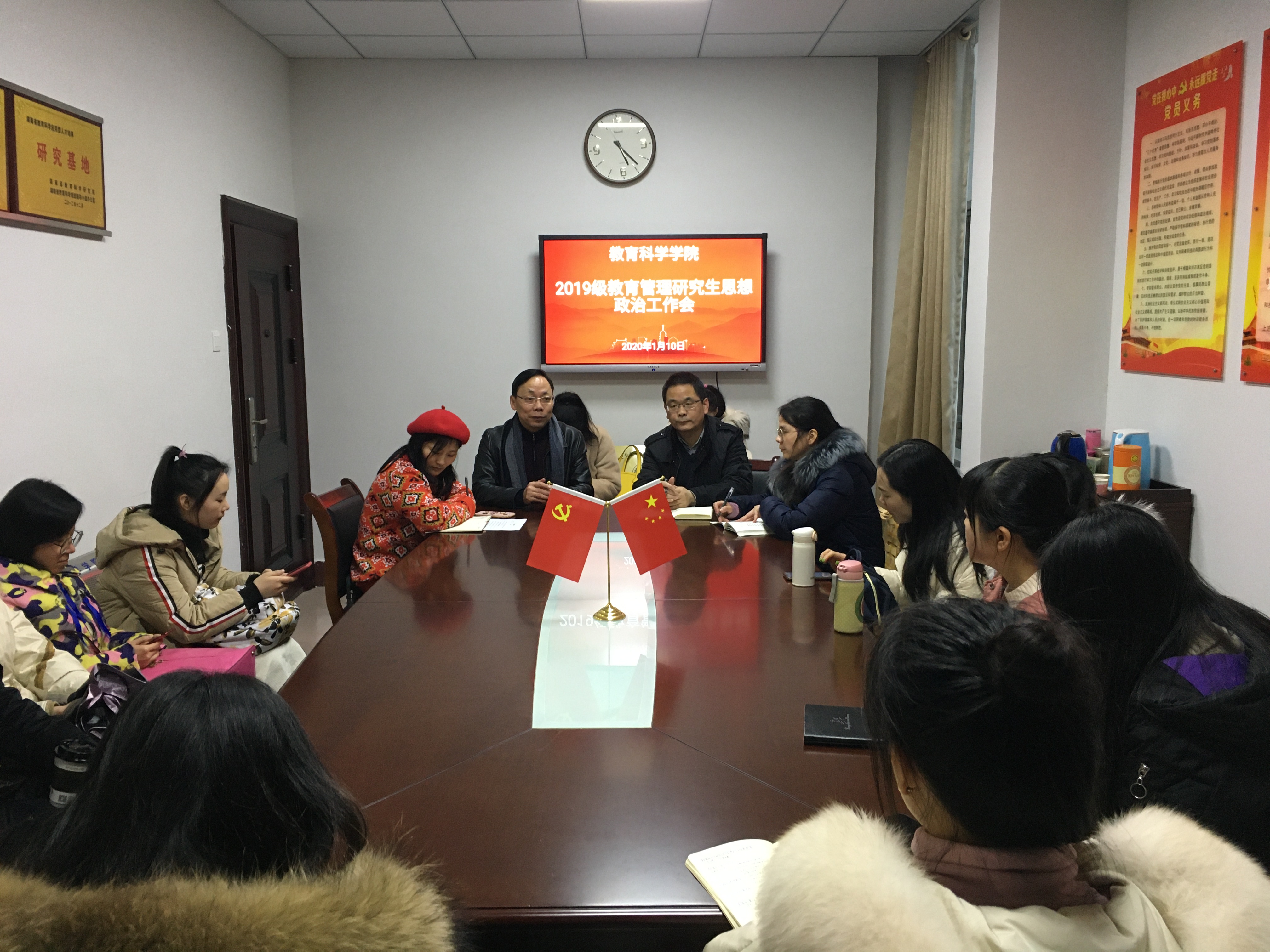 1月10日下午,教育科学学院在综合楼314会议室召开2019级教育管理专业研究生思想政治工作会议。学院院长刘理、党总支书记刘淳松、研究生辅导员王炜与会,2019级教育管理专业全体研究生参加。