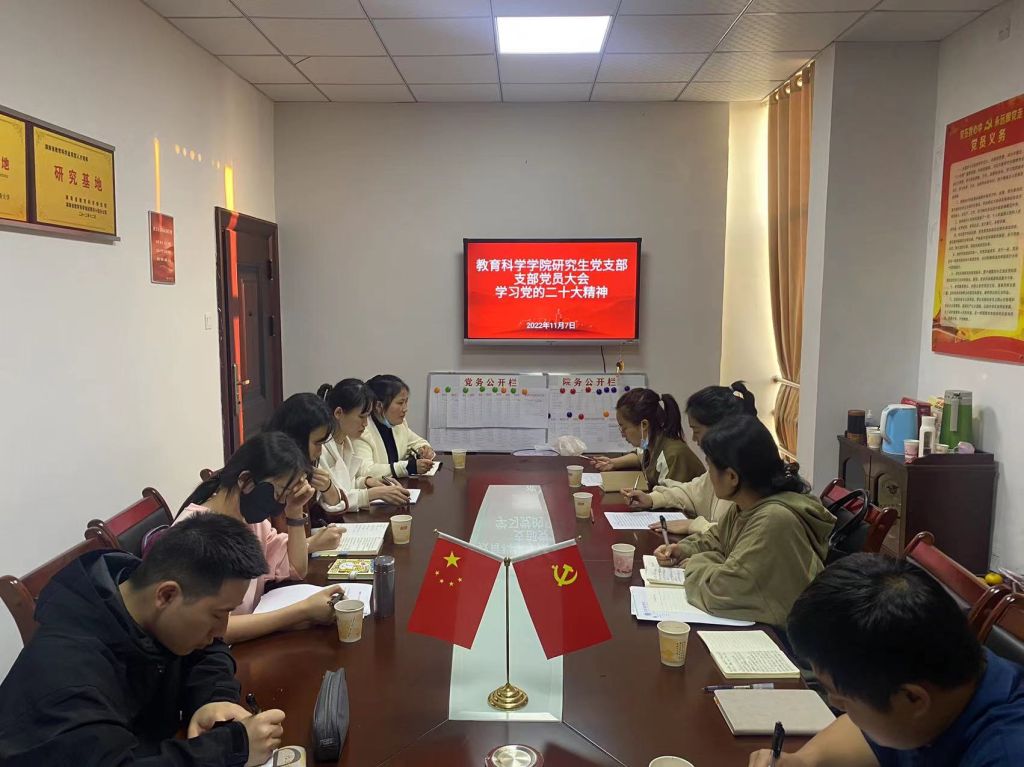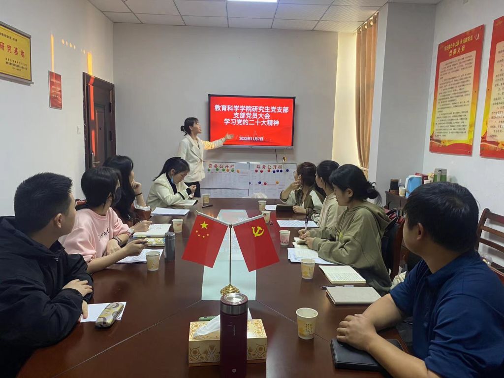 11月7日下午,教育科学学院研究生党支部在综合楼314会议室以“学习党的二十大精神”为主题开展专题学习和讨论。学院党总支专职组织员、研究生党支部书记王炜带领全体研究生党员参加学习。