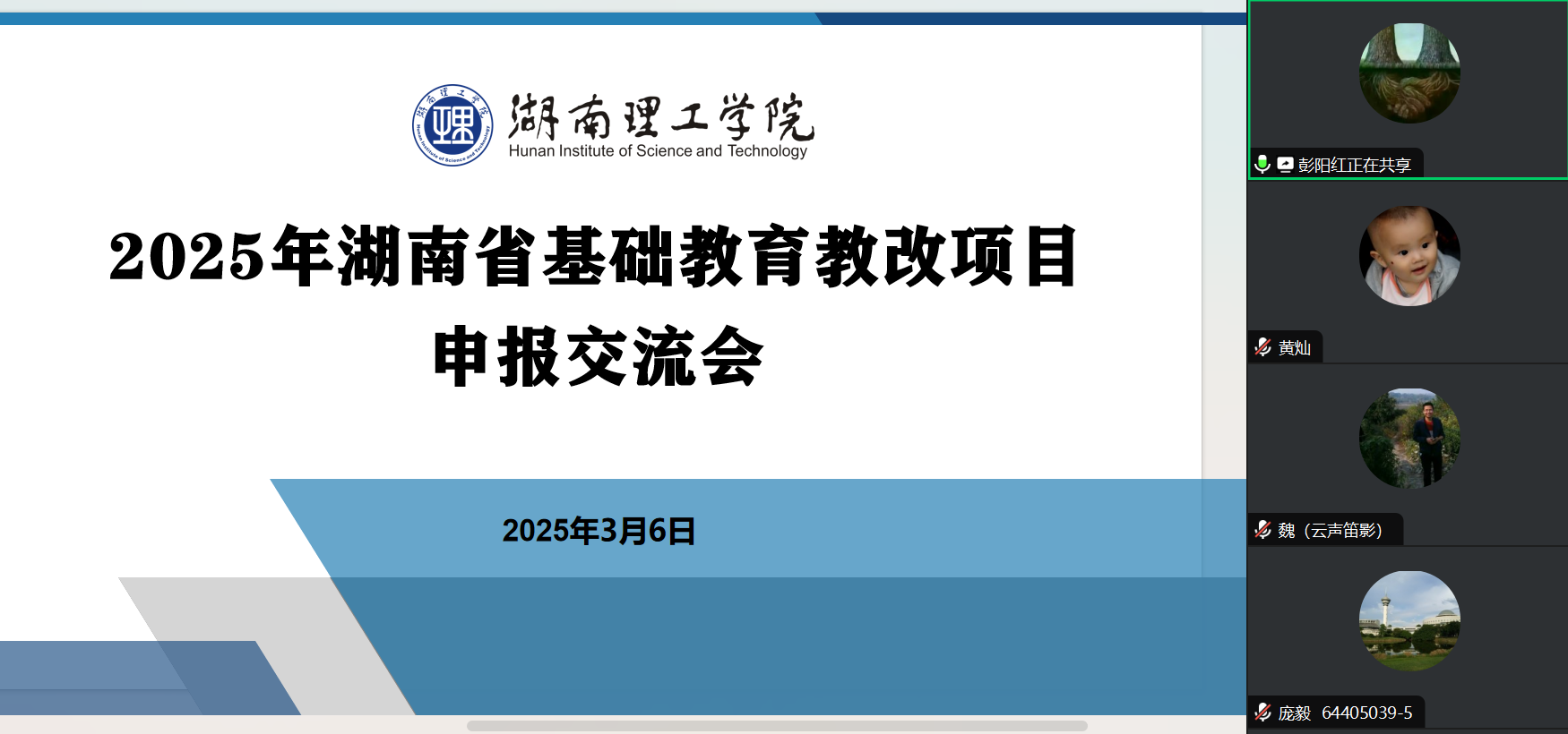 2025年3月6日,教育科学学院通过腾讯会议平台组织召开了2025年湖南省基础教育教改项目申报交流会。会议由教育科学学院主持工作的副院长彭阳红主持,拟推荐参评2025年湖南省基础教育教改项目的主持人参加会议。