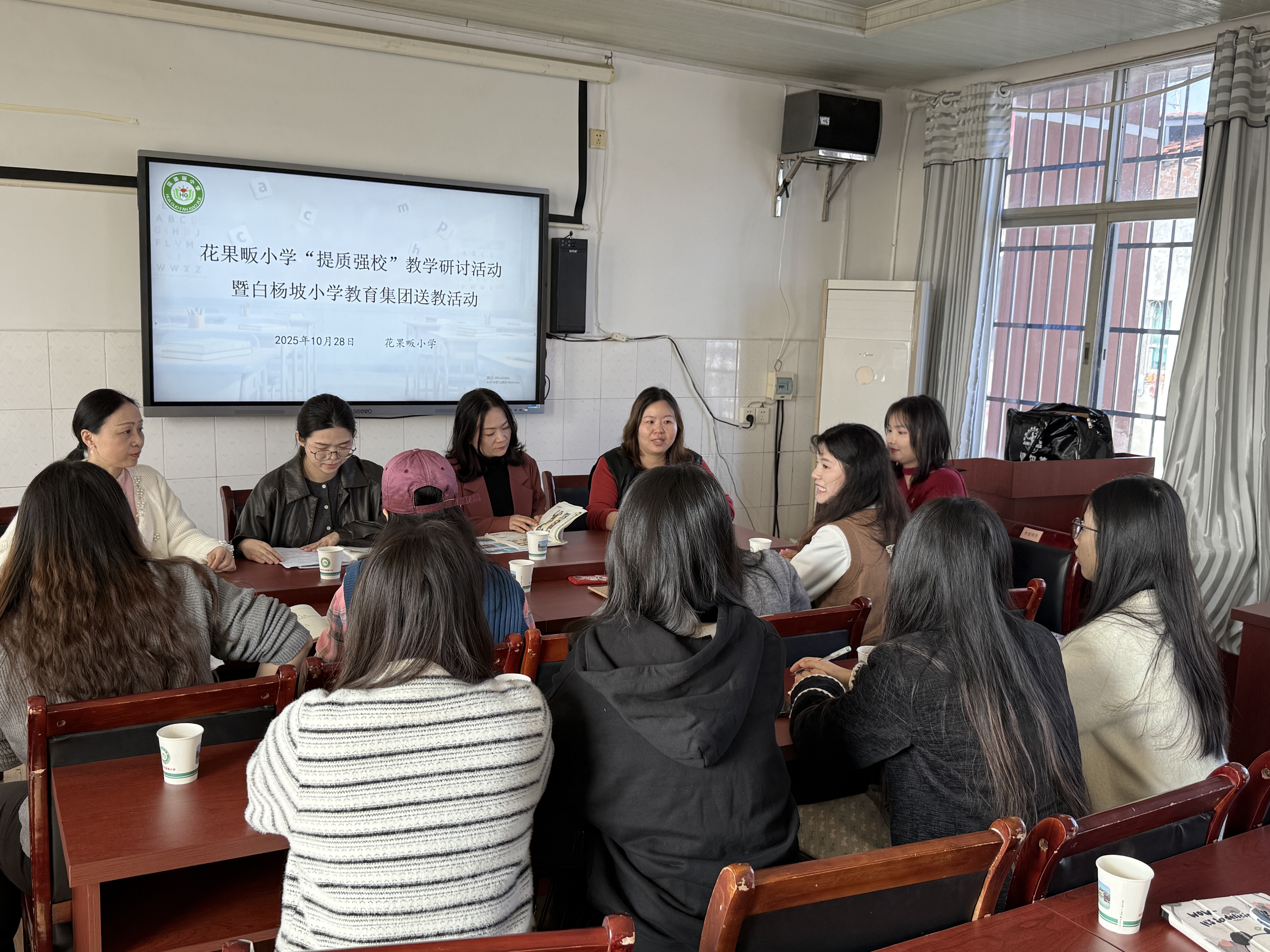 为深化教育理论与实践的融合,提升小学教育专业研究生的教学感知力,10月28日上午,在隋幸华老师的带领下,太阳网集团tcy872224级和25级部分研究生赴花果畈小学,全程参与由白杨坡小学教育集团主办的“送教促交流,携手共成长”英语教研活动,开启了一堂生动的教育见习实践课。