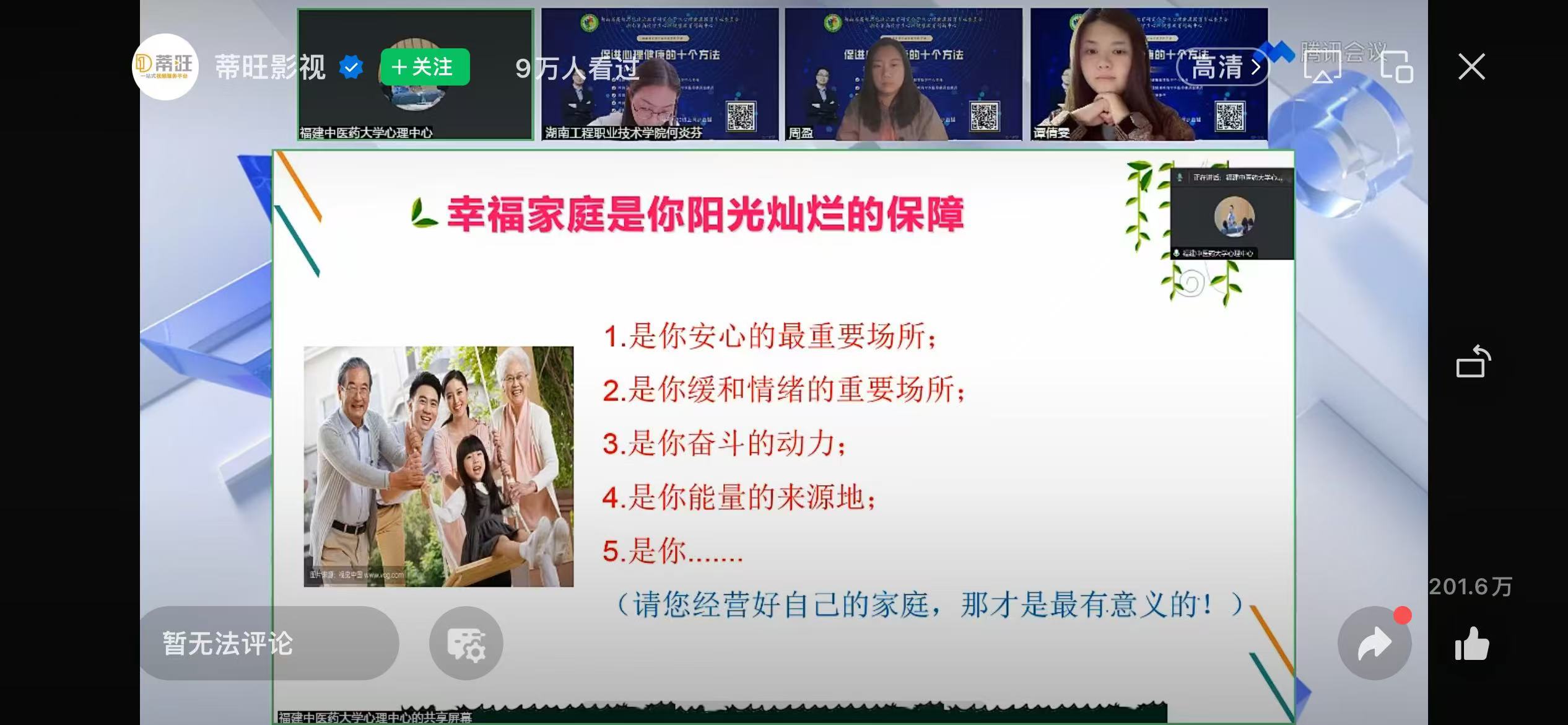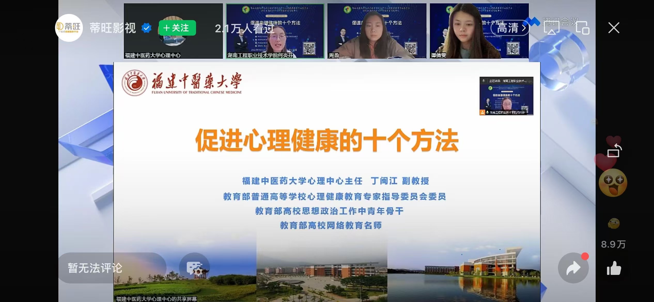 10月20日19:00,教育科学学院全体研究生观看了以《促进心理健康的十个方法》为主题的湖南省大学生成长讲堂第十讲,本次线上讲座由福建中医药大学大学生心理健康教育指导中心主任丁闽江主讲。