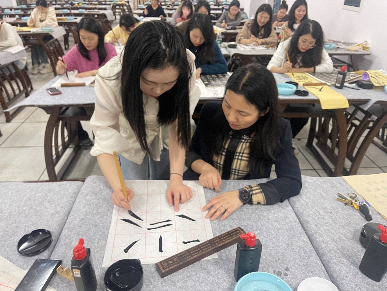 活动伊始,杨可馨讲解了毛笔书法的基础知识和入门方法,从“笔法”“字法”“章法”“等多角度教学,指导初学者掌握起笔、运笔、顿笔等书写要领,鼓励有基础的同学临摹创作,领悟书法作品的设计技巧和字体布局。她指出,书法之道精微,笔画有形态,笔法有质量;书法之韵绵长,“写”是传递“意蕴”的艺术,积硅步方能致远。