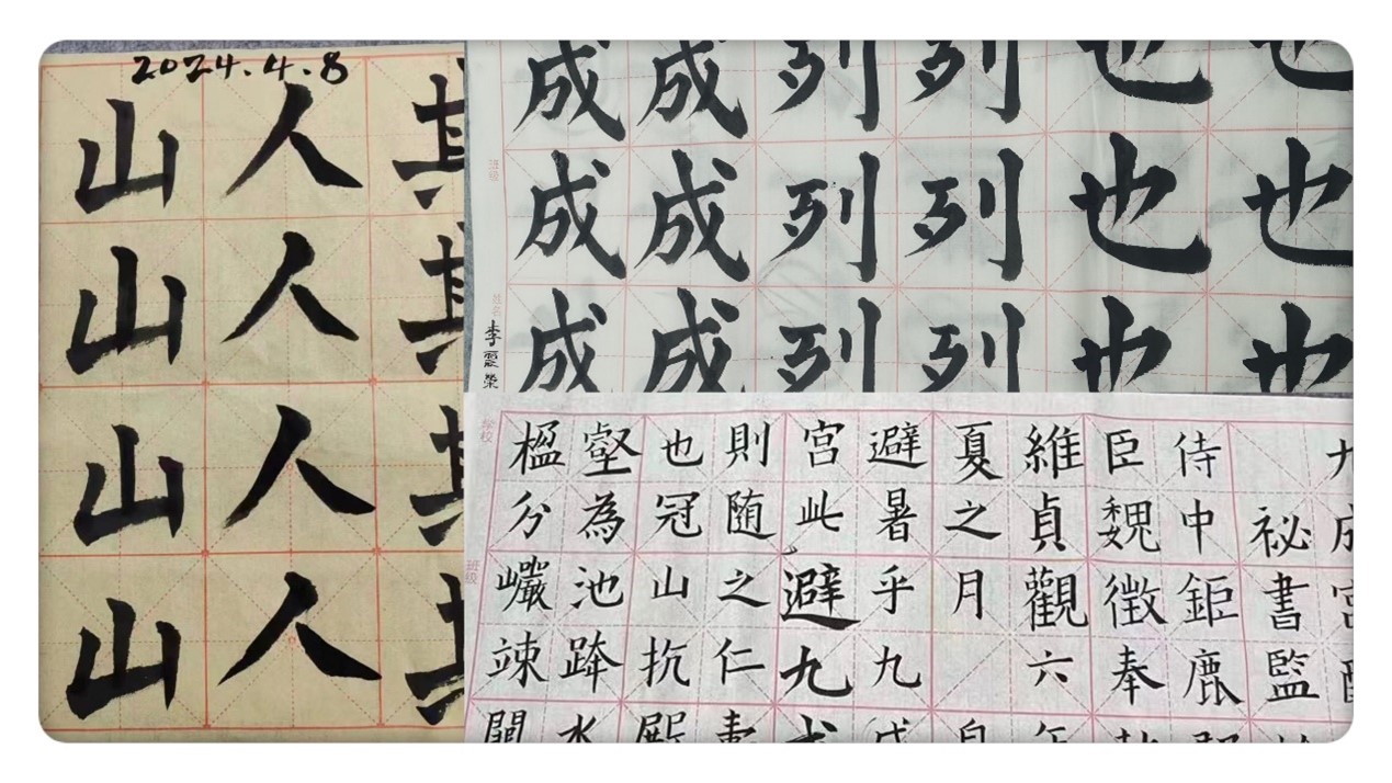 同学们进行毛笔书写练习,从字体的大小疏密,留白布局以及书法创作感悟等方面交流,相互学习并展示优秀书法作品。她们纷纷表示:书法不仅是文字的艺术,更是人格修养和精神追求的体现,作为一名教育硕士应提高自身的专业素质,培养良好的书写习惯。