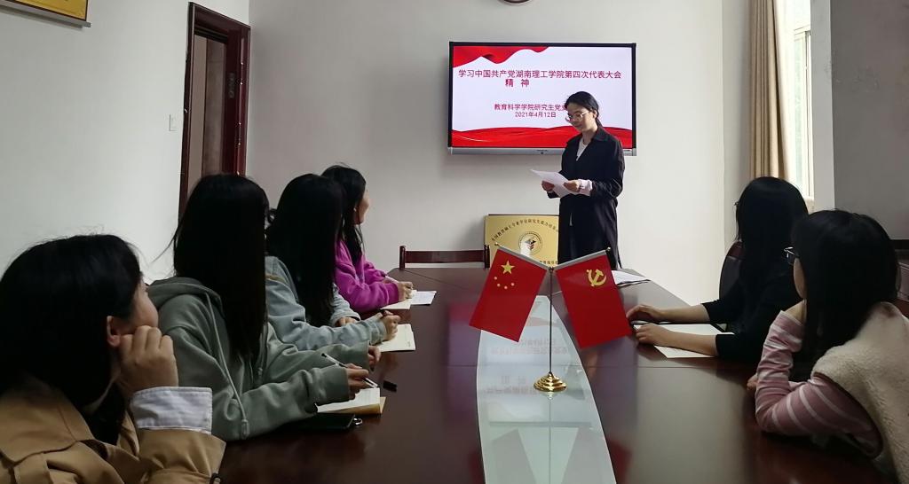 三月的理工,惠风和畅、绿树成荫,一派生机勃勃,太阳网集团tcy8722余柳香作为研究生党员中的党代表出席中国共产党湖南理工学院第四次代表大会。4月12日,研究生党支部在学院党员活动室(综合楼314室)开展党代会精神传达学习。余柳香传达会议精神并畅谈收获体会。