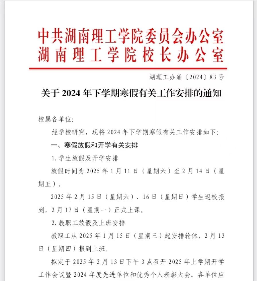 [通知]2024年下学期寒假放假及有关工作安排通知