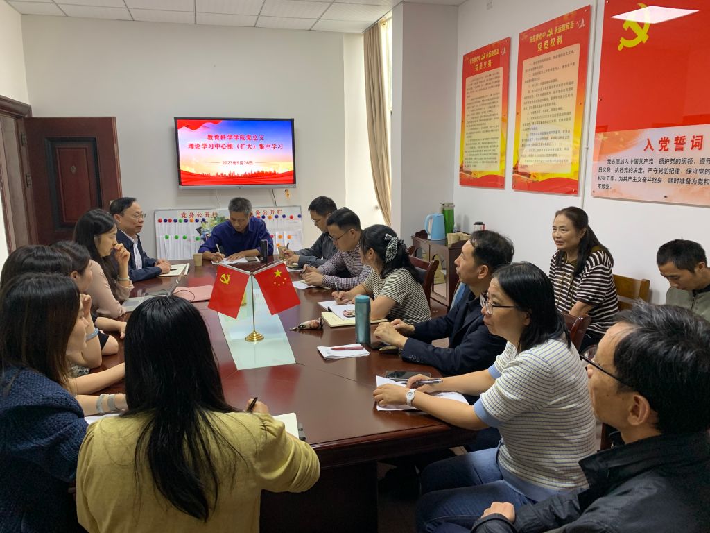 9月26日下午,教育科学学院党总支理论学习中心组(扩大)集中学习在综合楼314会议室进行。学院中心组全体成员、全院教师参加学习。