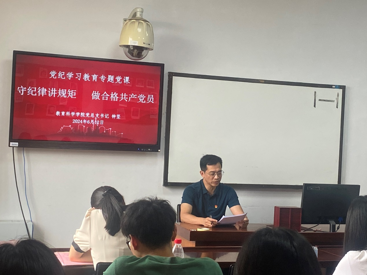 6月12日上午,教育科学学院研究生党支部在1号教学楼1301B会议室开展党课教育。党总支书记钟坚担任主讲,党支部书记王炜、全体研究生党员及入党积极分子参加.