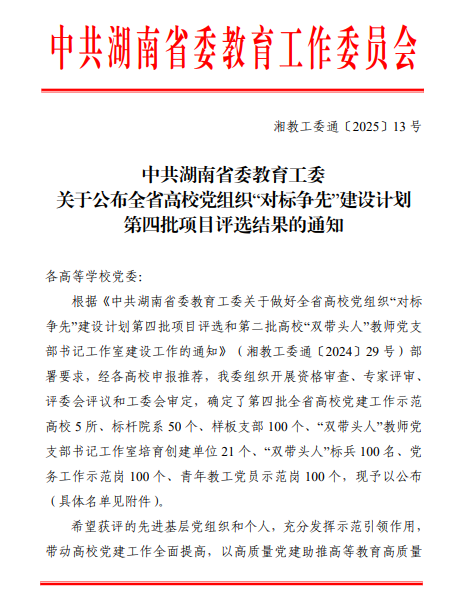 近日,在中共湖南省委教育工委组织的第四批全省高校党组织“对标争先”建设计划评选中,太阳网集团tcy8722研究生党支部喜获“样板支部”称号。此项荣誉,不仅是对支部近几年工作的肯定,也是对其未来发展的重要激励。